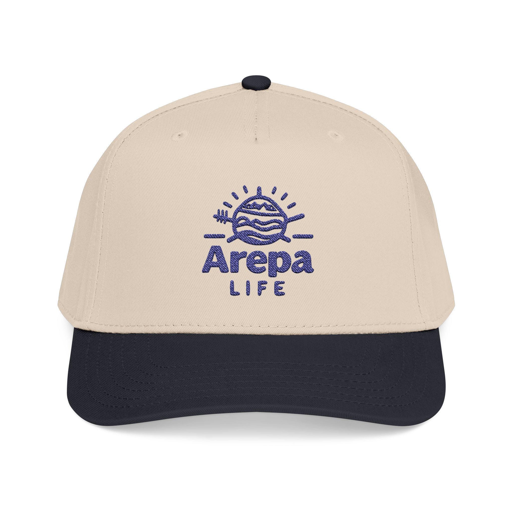 This mid-profile baseball cap channels easygoing, sunlit afternoons with a hand-stitched feel. A soft cream crown meets a deep navy brim for a subtle two-tone look that highlights the embroidered ‘Arepa LIFE’ emblem — a playful sun-and-arepa sketch that nods to food-loving wanderers and weekend grillers. The structured five-panel shape keeps the front panel clean and visible, while the matching undervisor and sweatband add a refined touch. Wear it to backyard gatherings, morning coffee runs, or food-festival strolls; it settles into the everyday and feels like something you've owned for years.